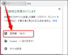 ブラウザのURL欄左側にある鍵アイコンをクリックし、「証明書」をクリックします。