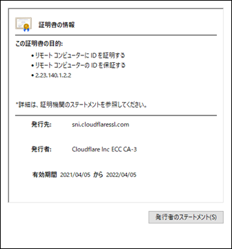※ 発行者の名称が「Cloudflare」や「Let’s Encrypt」の場合も注意が必要です。(無料で利用可能な為)