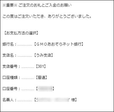 また、いざ購入手続きを行うと、振込口座のメールが届きます。